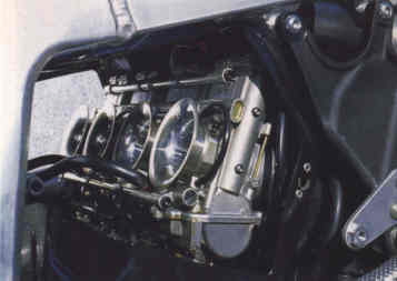 - a steering-damper is mounted under the front- fork –bridge, - this sport-production got a special carb type, the Mikuni TMR40 ( flat-carbs with 40mm intake)